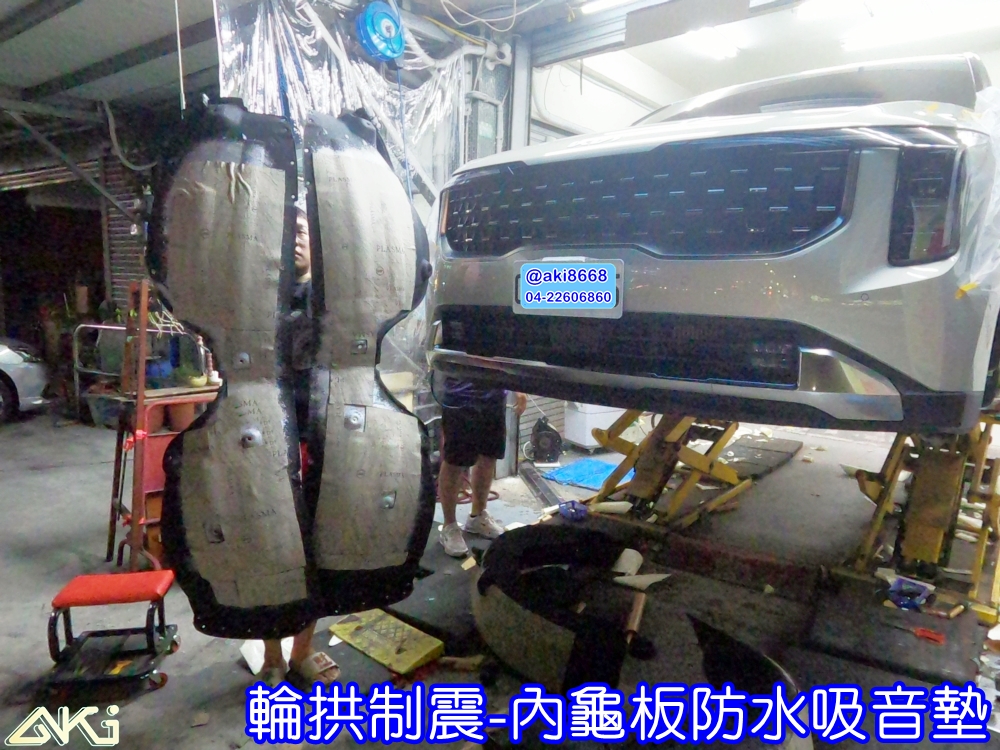 在 AKI 汽車隔音中心的 輪拱隔音工程 規劃中,會依照 CARNIVAL 的車體結構與噪音特性,搭配 制震隔音材料 與 高品質吸音棉,形成完整且有效的隔音系統。